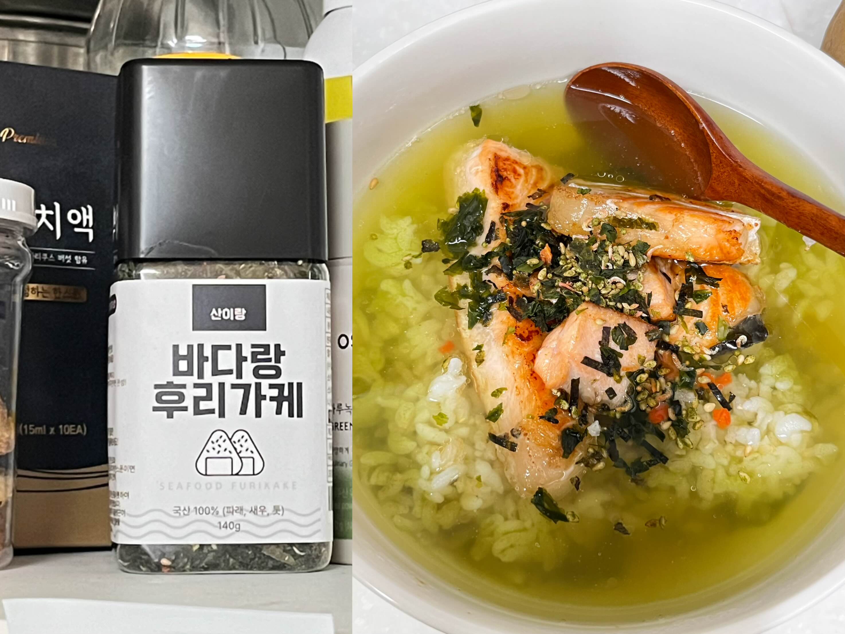 마지막으로 바다랑 후리가케까지 솔솔 뿌려줍니다! 집에 있는 김가루도 상관 없어요 자기가 원하는 만큼 뿌려주면 됩니다